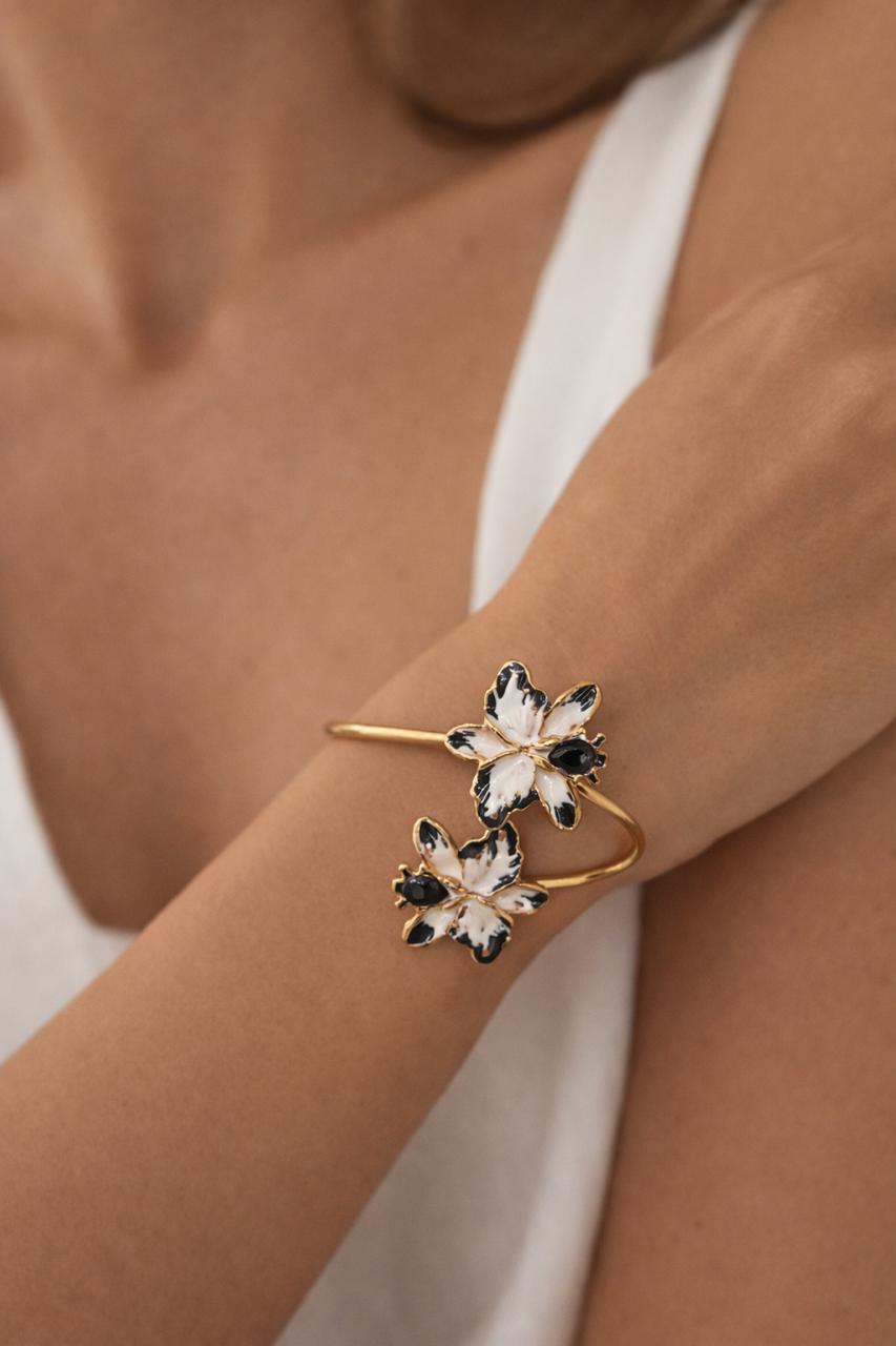 BRACELETE DUAS FLORES PRETO BRANCO