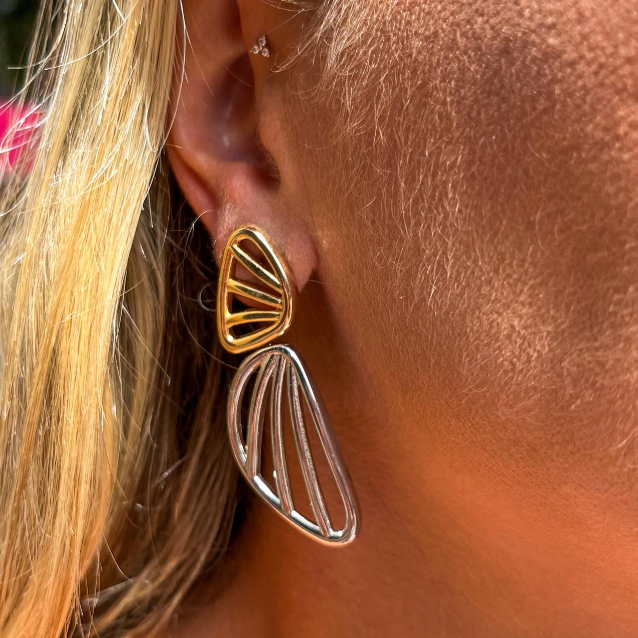 BRINCO EM BANHO DE RODIO BRANCO E OURO, COM DETALHES EM GRADES.