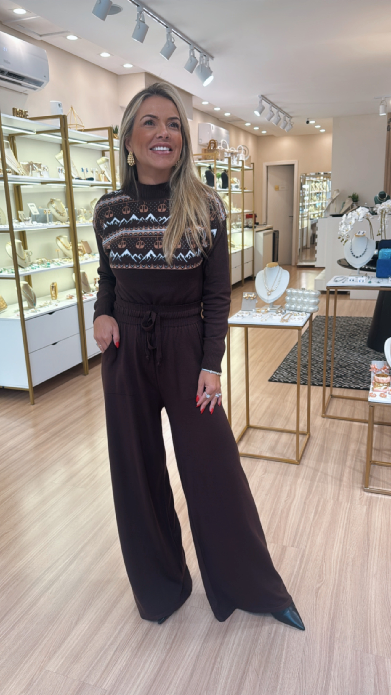 CONJUNTO TRICOT CALÇA/BLUSA ESTAMPADA MARROM