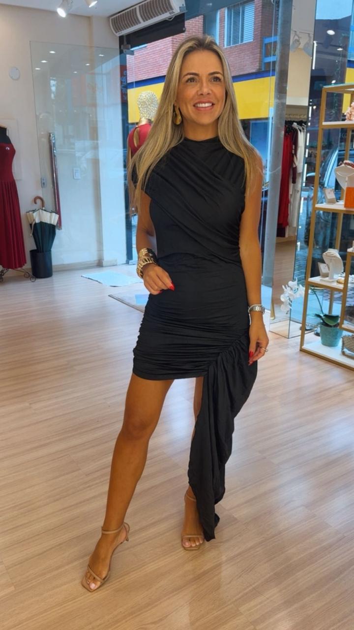 VESTIDO CURTO GOLA DRAPEADO FAIXA PRETO